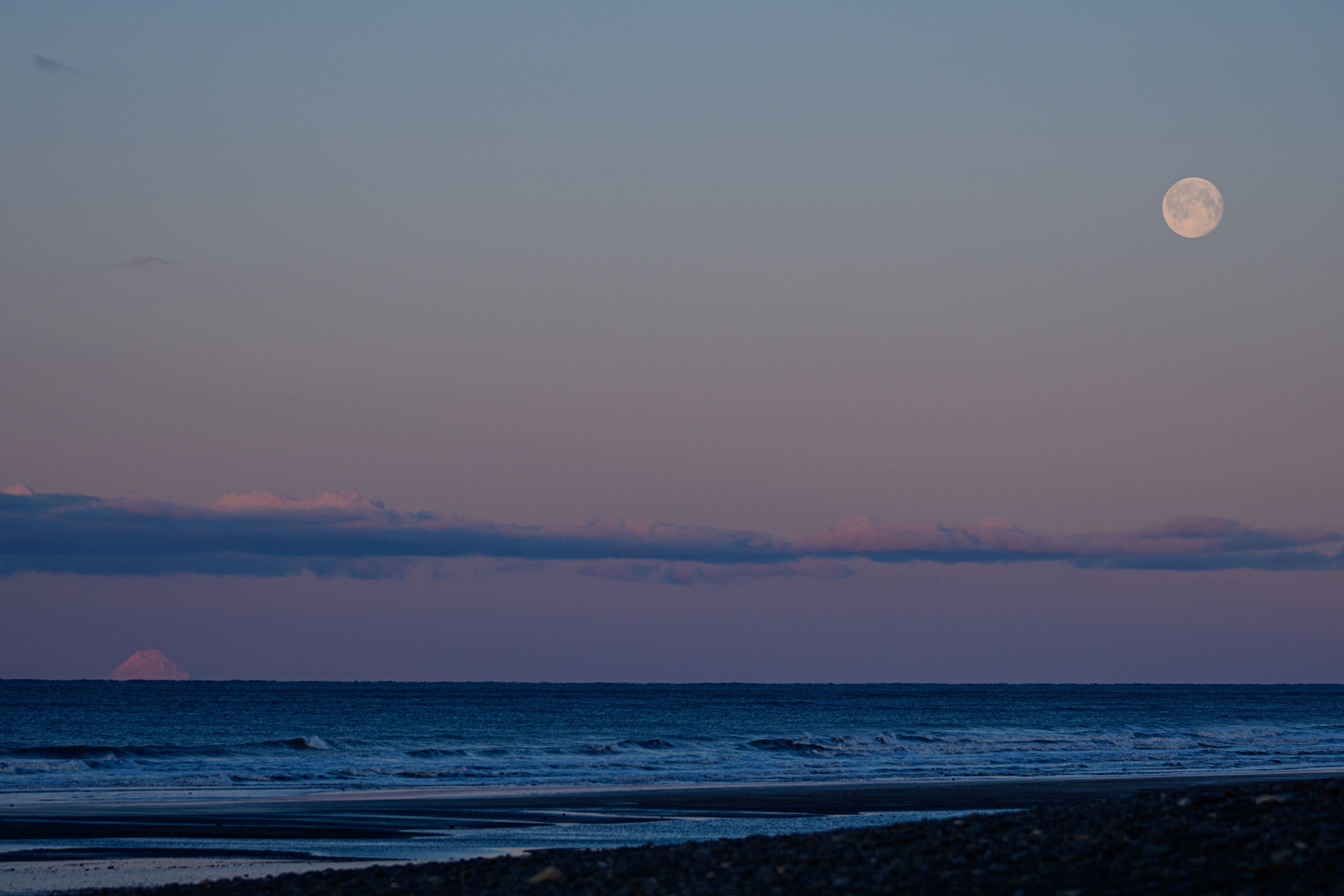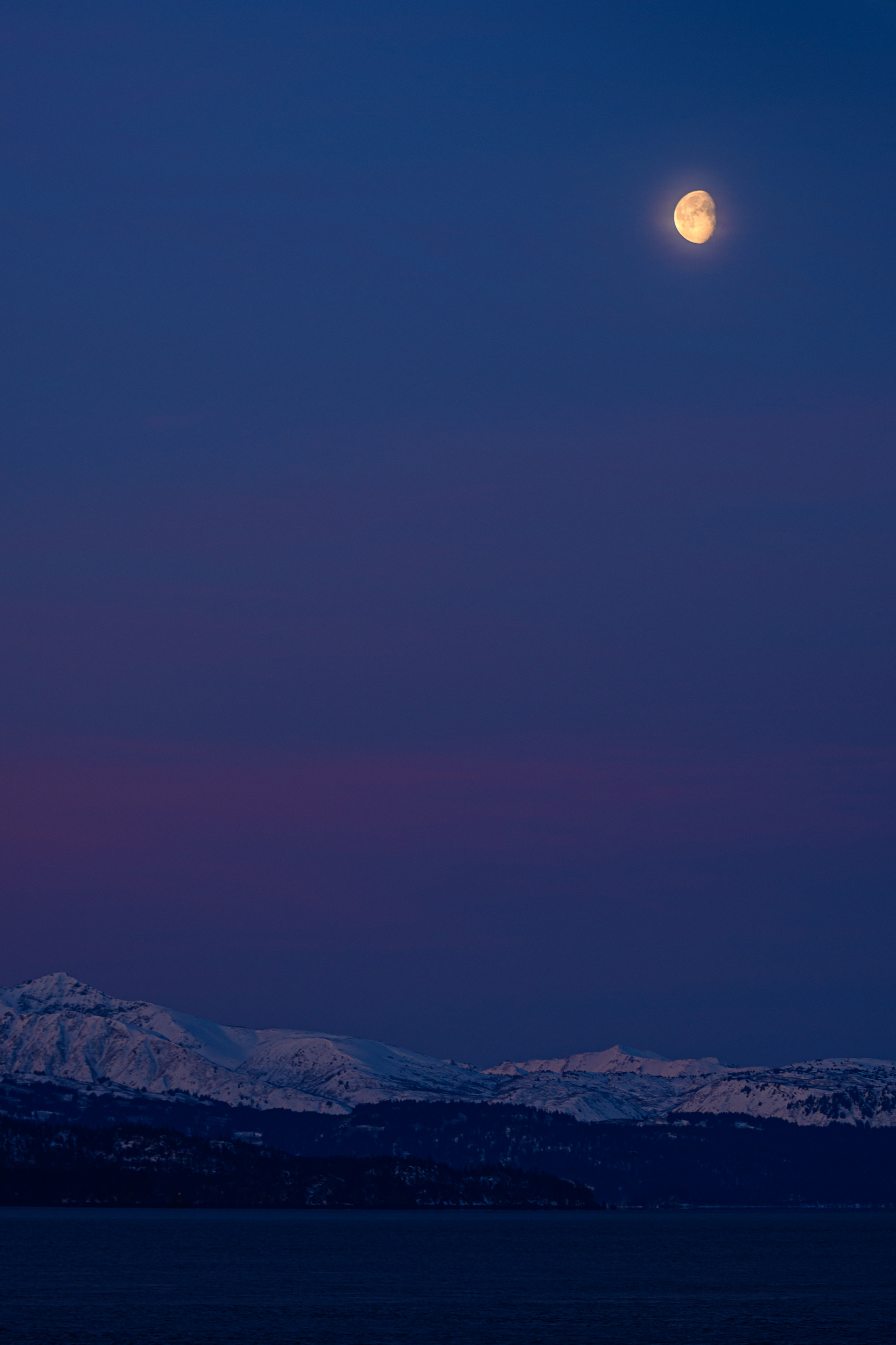 Moon over mountain at sunset, Mat-su Valley, Alaska